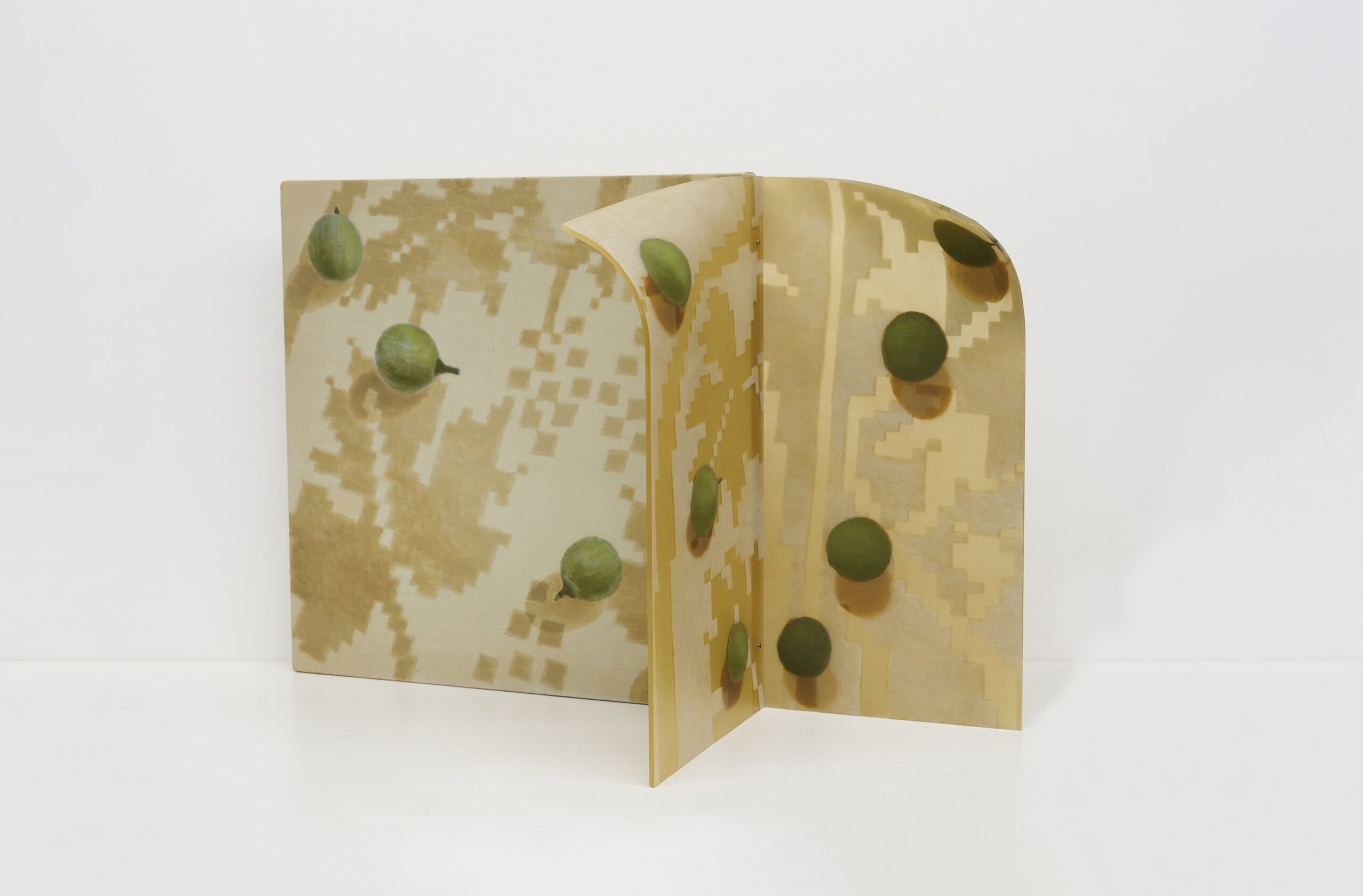 イメージと物質の関係を問い直しながら、軽やかで揺らぎのある表現方法を追求している。モチーフには、考古物や古物のように長い時間受け継がれてきたものと、日々形が変化する果物のイメージを描いている。支持体には透明な素材を選んでいるので、その上に薄く伸ばした絵の具は透過しており、さらに、それぞれ描くモチーフに合わせて湾曲させているので、完成した作品は、軽やかに、浮ぶように存在する。