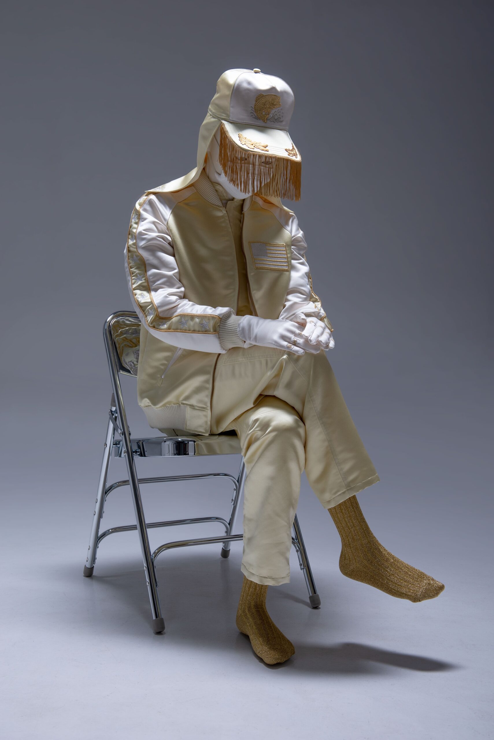 At the heart of the exhibition stands a sculptural installation: a circle of six chrome-plated folding chairs arranged in dialogue. A life-sized seated figure occupies one chair, draped in gold and white satin, wearing a custom Sukajan jacket embroidered with “Milton, Paradise Lost” and adorned with an American flag. The figure’s meditative posture—head slightly bowed, face partially obscured by a gold-fringed trucker cap and silk mask—evokes both presence and absence, commemoration and contemplation. Four additional Sukajan jackets rest on surrounding chairs, each embroidered with phrases including “Milky Way,” “A Dream,” “Morimoto,” and “The Horror.” One chair remains conspicuously empty.